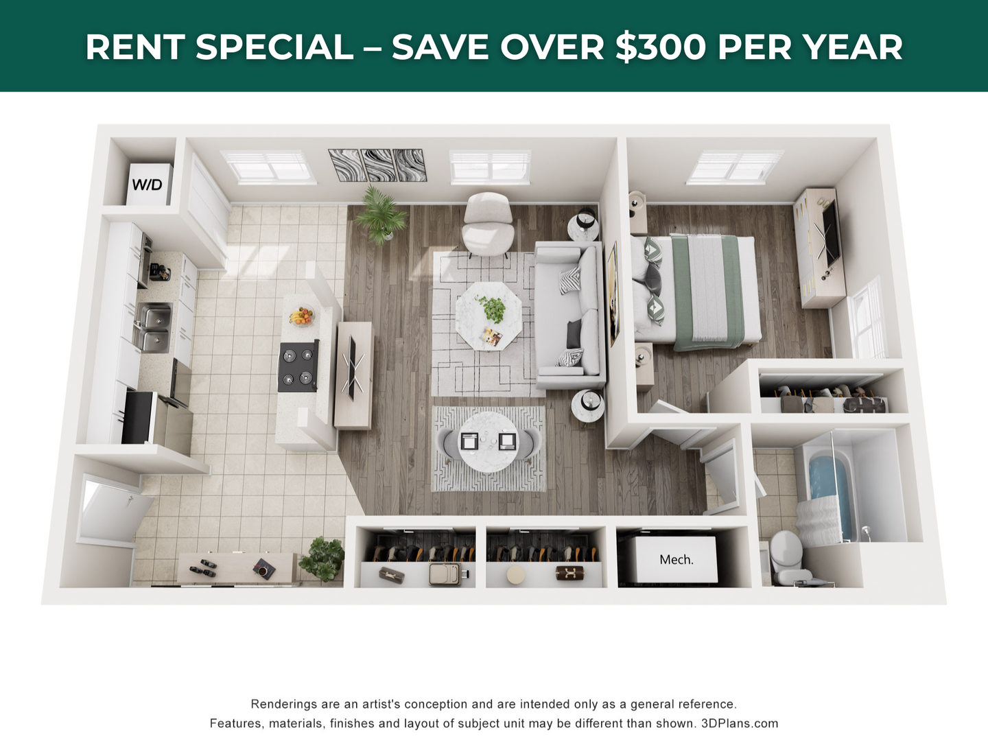 Modern 1-bedroom, 1-bath apartment with open-concept living. Enjoy a full kitchen with stainless steel appliances, in-unit washer/dryer, and ample closet space.