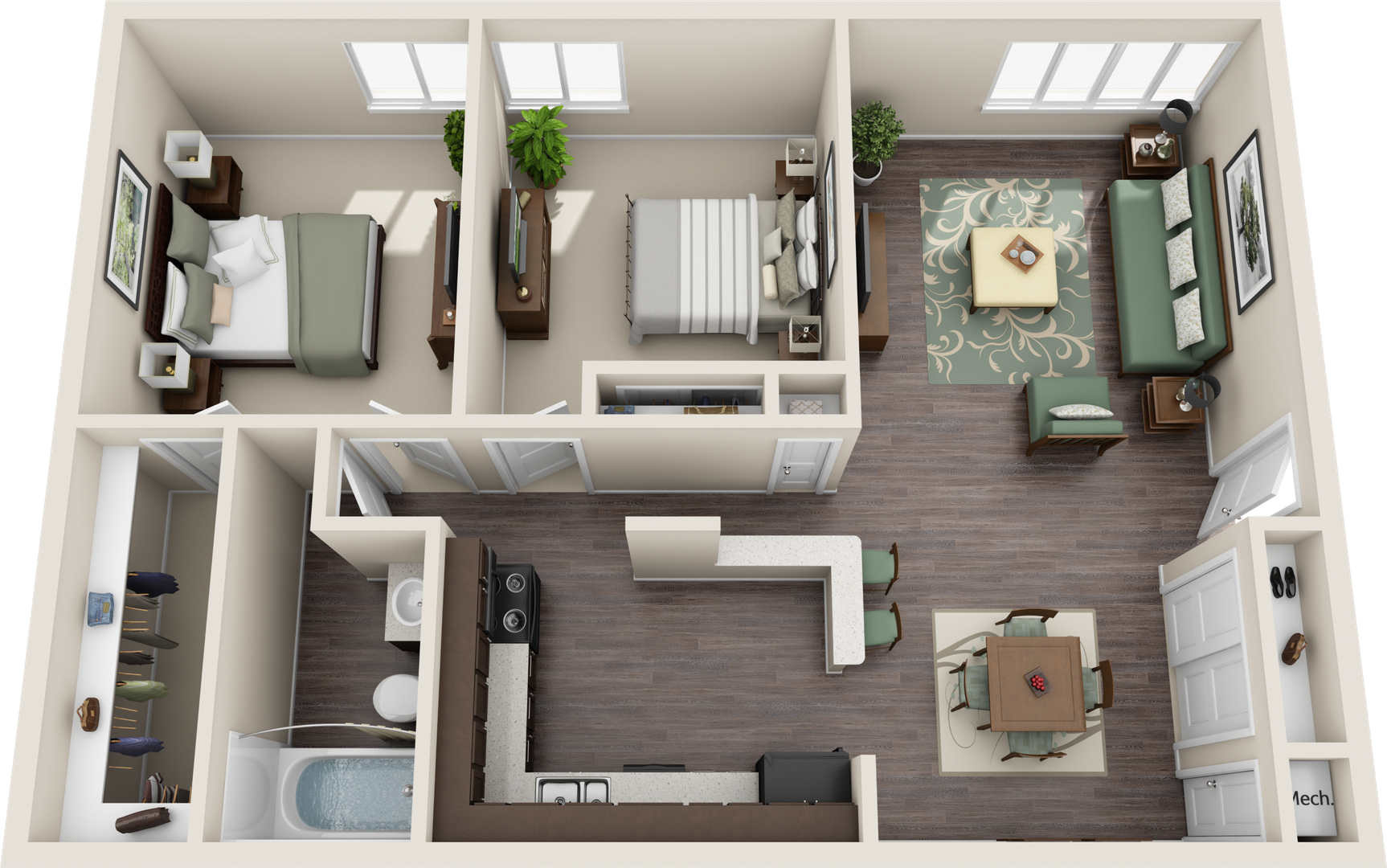 This two-bedroom apartment has been updated with luxury finishes, including countertops, vinyl plank flooring, cabinets, carpet, and appliances. Apartments have been upgraded with new doors, hardware, plumbing, light fixtures, and window coverings.