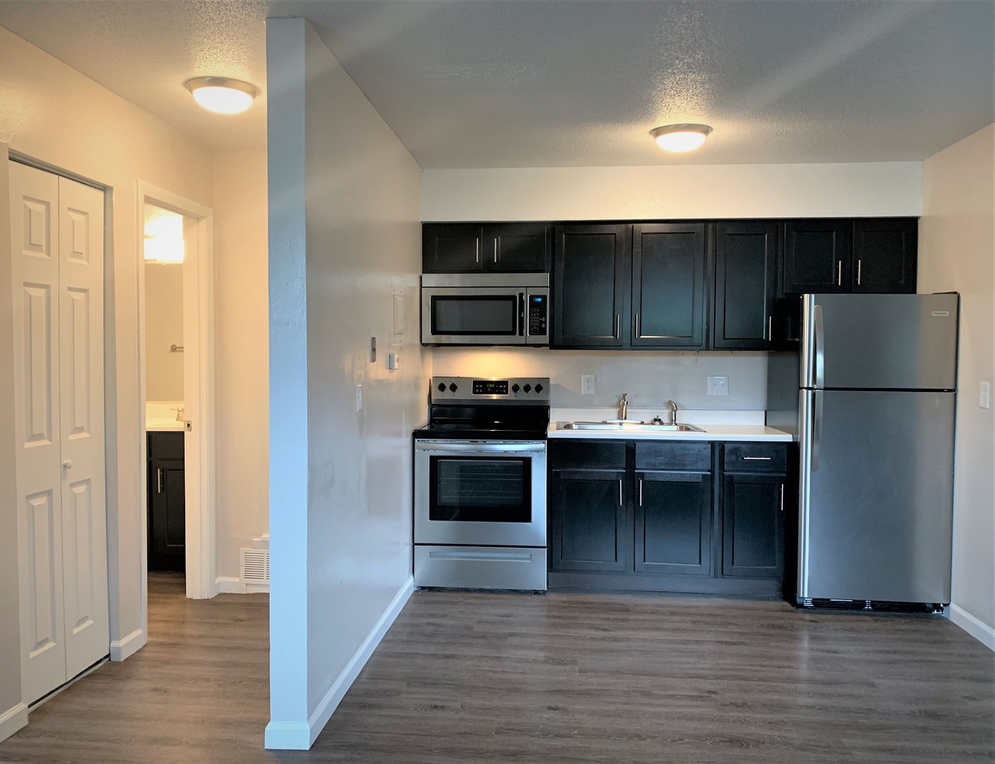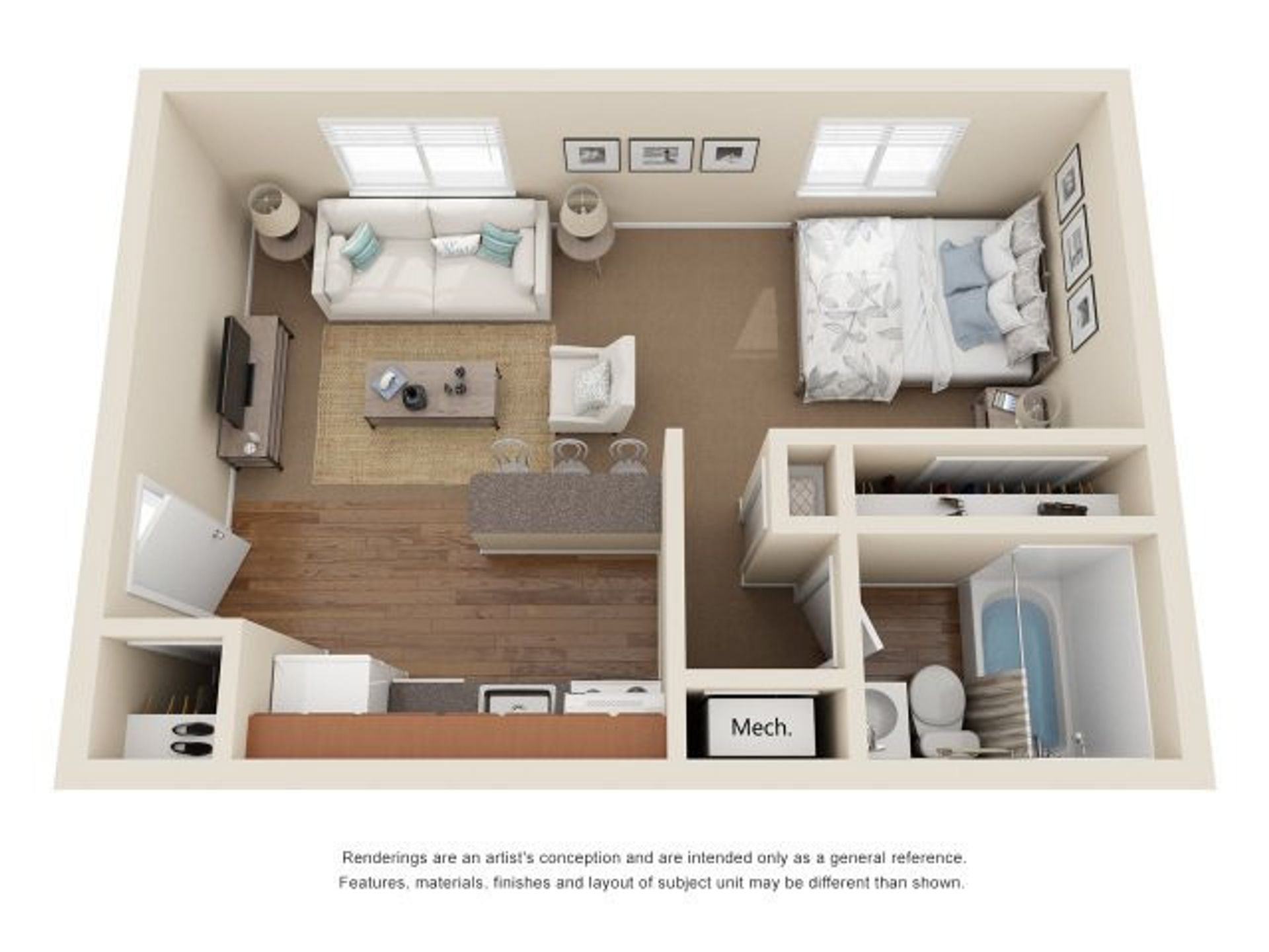 Experience spacious and affordable studio living with two floorplans to choose from, featuring a full-size refrigerator, oven range, generous living area, and a semi-private bedroom.